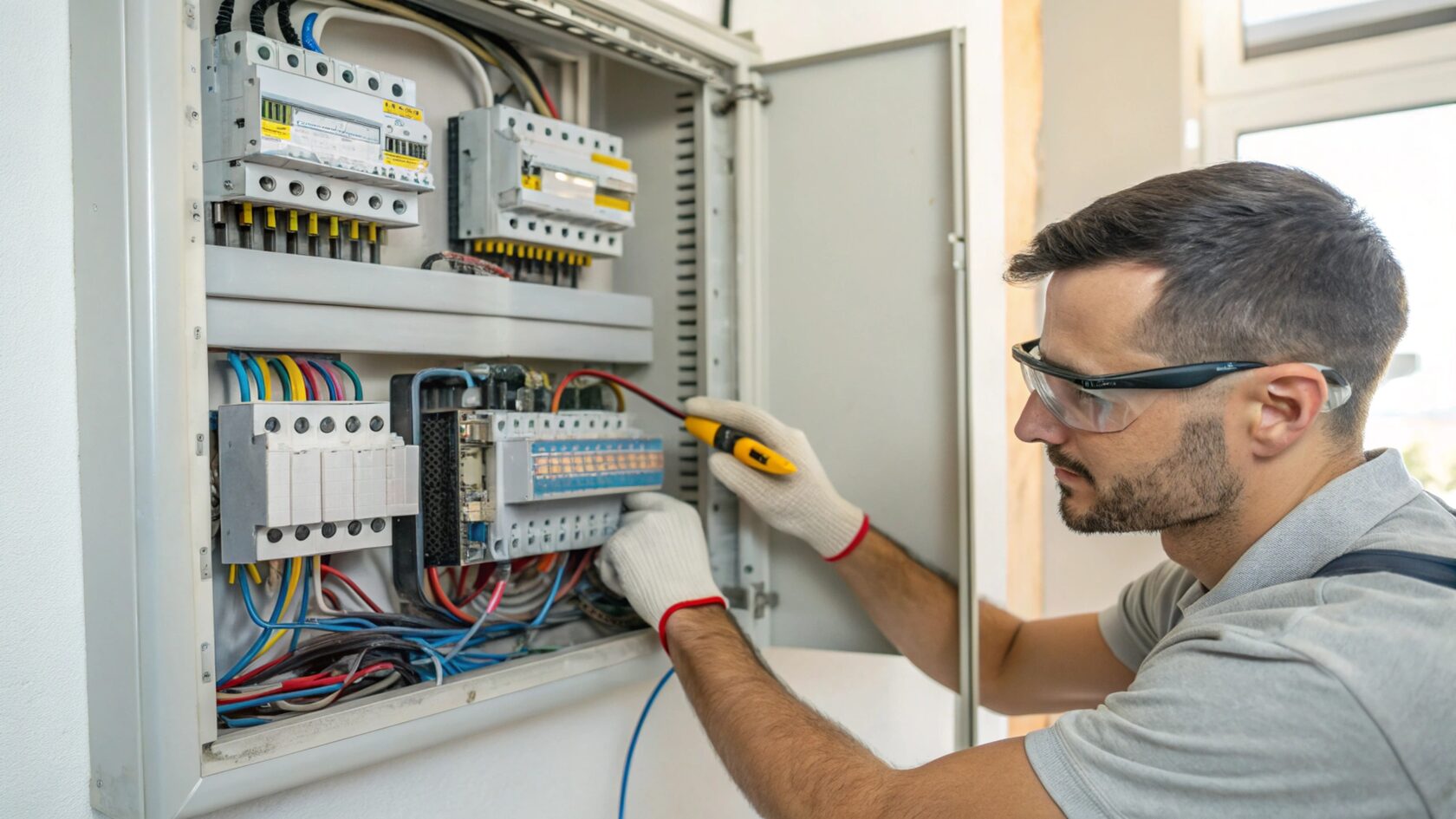 Установка электрощита. Его размещают так, чтобы был удобный доступ для управления и обслуживания. Оптимальная высота от пола – 1,5 метра. Верхний ряд выключателей ставят на уровне глаз.
